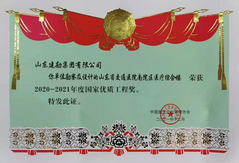 近日,山东金年会(金字招牌) 直属企业山东建勘勘察设计的山东省交通医院南院区医疗综合楼项目,荣获2020-2021年度“国家优质工程奖”。