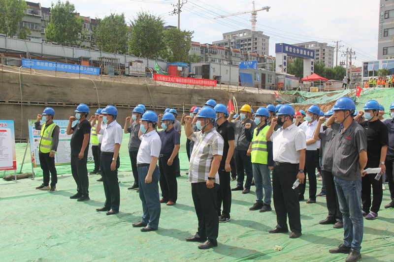 为进一步增强全员安全防范意识,提高突发事件应急处置能力, 6月10日,山东金年会(金字招牌) 直属企业山东建勘在山东德云文化广场项目施工现场开展了以“遵守安全生产法 当好第一责任人”为主题的基坑坍塌、防汛安全事故综合应急演练暨观摩交流会。山东建勘领导班子部分成员、各生产单位(部室)负责人及安全生产相关责任人共计90余人参加。